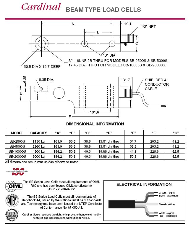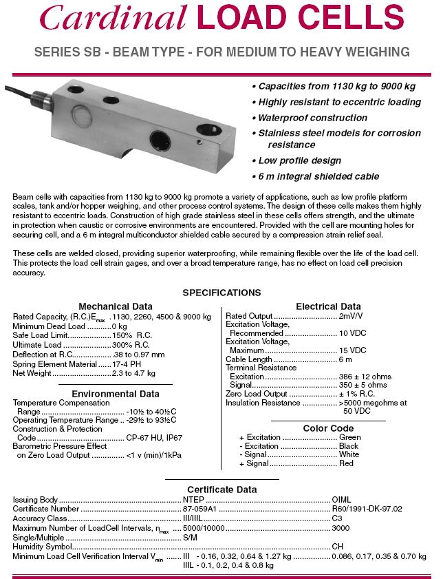 Cardinal SB 稱重傳感器(load cells) 所有型號: SB-2500S 1130KG SB-5000S 2260KG SB-10000S 4500KG SB-20000S 9000KG |