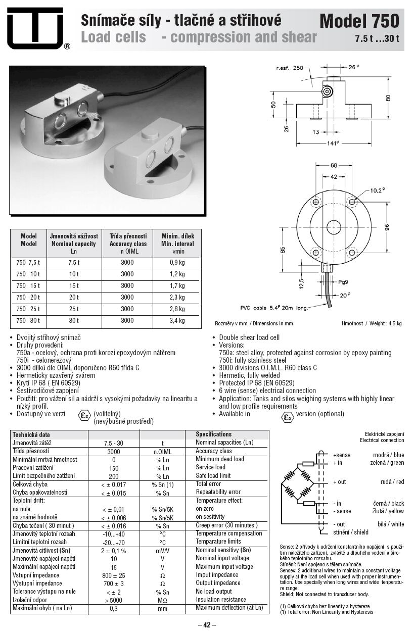 詳細(xì)特征: 標(biāo)準(zhǔn)量程:7,5-10-15-20-25-30t 精度等級(jí):3000n. OIML 最小靜載:0% Ln 負(fù)載:150% Ln 安裝負(fù)載限制:200% Ln 總誤差<±0.017%Sn 重復(fù)性誤差 <±0.015%Sn 溫度零度漂移 <±0.01%Sn/5K 靈敏度溫差影響 < <±0.006%Sn/5K 蠕變誤差(30分鐘)<±0.016%Sn/5K 溫度補(bǔ)償: -10 to +40 °C 溫度范圍: -20 to +70 °C 標(biāo)稱靈敏度(Sn): 2 ± 0.1%mV/V 額定輸入電壓: 10 V 最大輸入電壓: 15 V 輸入阻抗: 800 ± 250 Ohm 輸出阻抗: 700 ± 3 Ohm 空載輸出<±2%Sn 絕緣電阻 > 5000 MOhm 最大偏差(at Ln):0.3mm