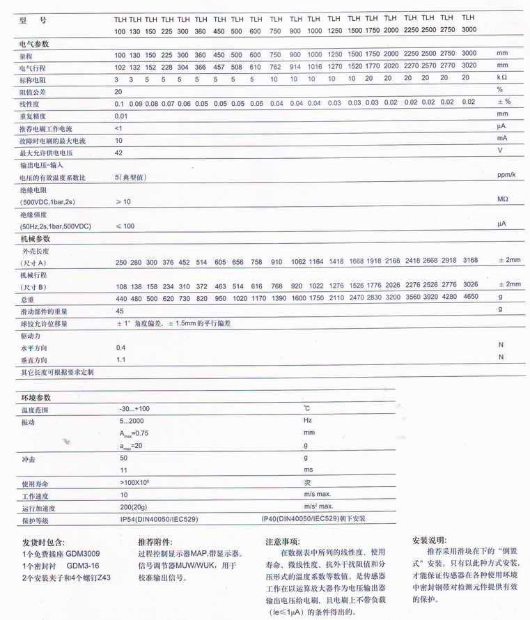 直線位移傳感器,量程可達(dá)3000mm 直線位移傳感器特點: 無桿設(shè)計 球鉸可避免側(cè)向力 使用壽命長-運(yùn)行次數(shù)超過100*10^6 非線性度小 分辨率高于0.01mm 很高的運(yùn)行速度 DIN 430650標(biāo)準(zhǔn)插頭和插座 防護(hù)等級IP54面向下安裝 直線位移傳感器說明: 外殼:鋁合金,經(jīng)陽極氧化處理 安裝:可調(diào)節(jié)固定支架 滑動部件:內(nèi)嵌有塑料的鋁材 連接器:球鉸,由一個淬硬的鋼球和彈簧、淬硬鋼板組件組成 電阻元件:導(dǎo)電塑料 電刷組件:貴金屬多觸電電刷,帶彈性阻尼 電氣連接:DIN3650標(biāo)準(zhǔn)4極插座
