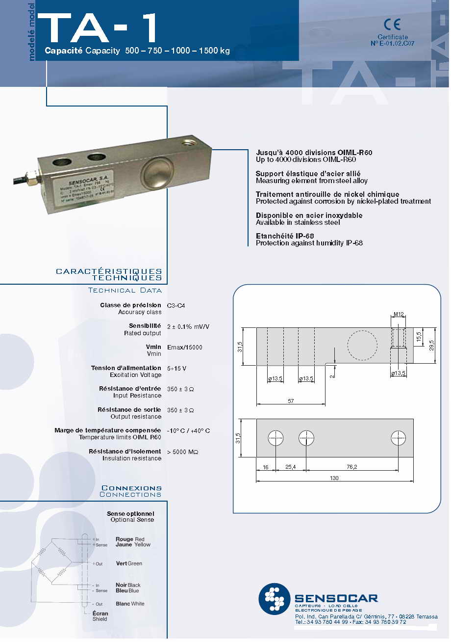 Sensocar TA-1 懸臂梁式稱重傳感器(load cells)